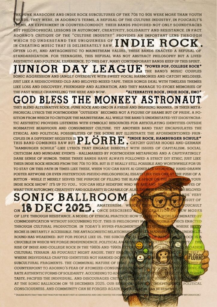 Im vorweihnachtlichen Bratwurst- und Mandarinendunst treffen Indie-Rock auf Emo-Rock. God bless the Monkey Astronaut, Junior Day League und Plörre verlassen den schimmeligen Proberaumkeller für ein letztes Hallo 2025.